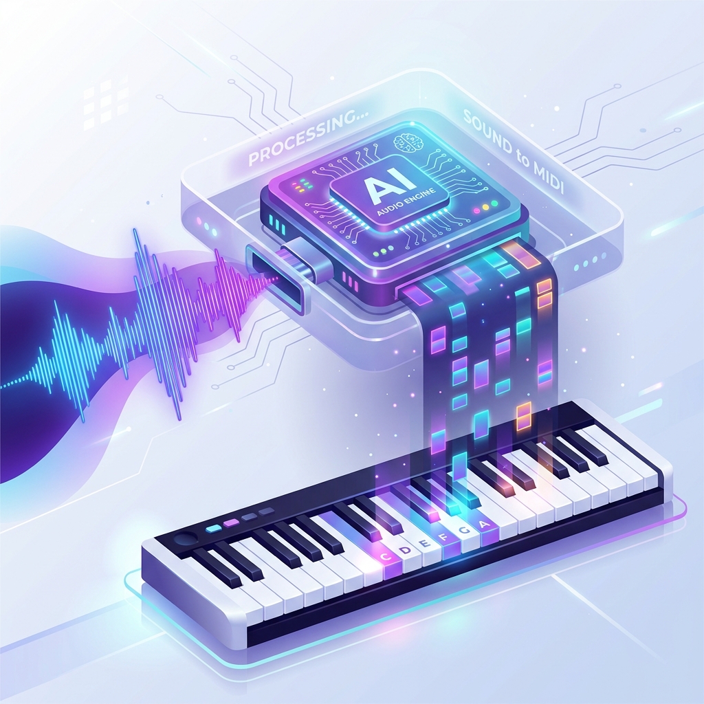 传统的音频转 MIDI 转换器在处理这类音频时非常吃力,它们常常会生成密集的“幽灵音符”,或者根本识别不出复杂的和弦。这也是为什么利用现代 AI 驱动工具来提取钢琴 MIDI变得如此重要——这些 AI 模型通过学习数以千万计的真实钢琴演奏数据,能够精准区分出密集的和声与细腻的敲击细节。